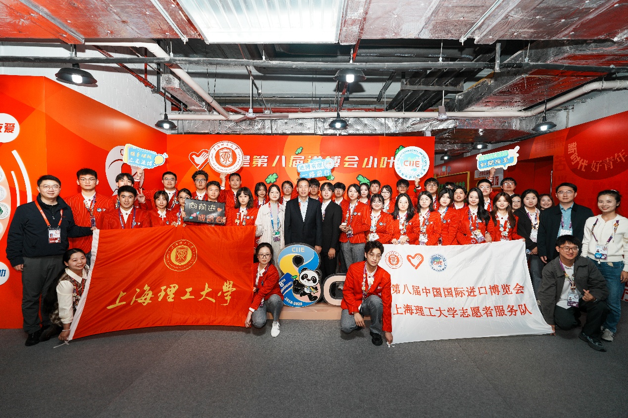 11月9日下午,党委书记王凌宇,党委副书记、副校长刘德强一行来到第八届中国国际进口博览会现场,亲切慰问服务在进博一线的上理“小叶子”志愿者,向他们致以诚挚问候和衷心感谢。