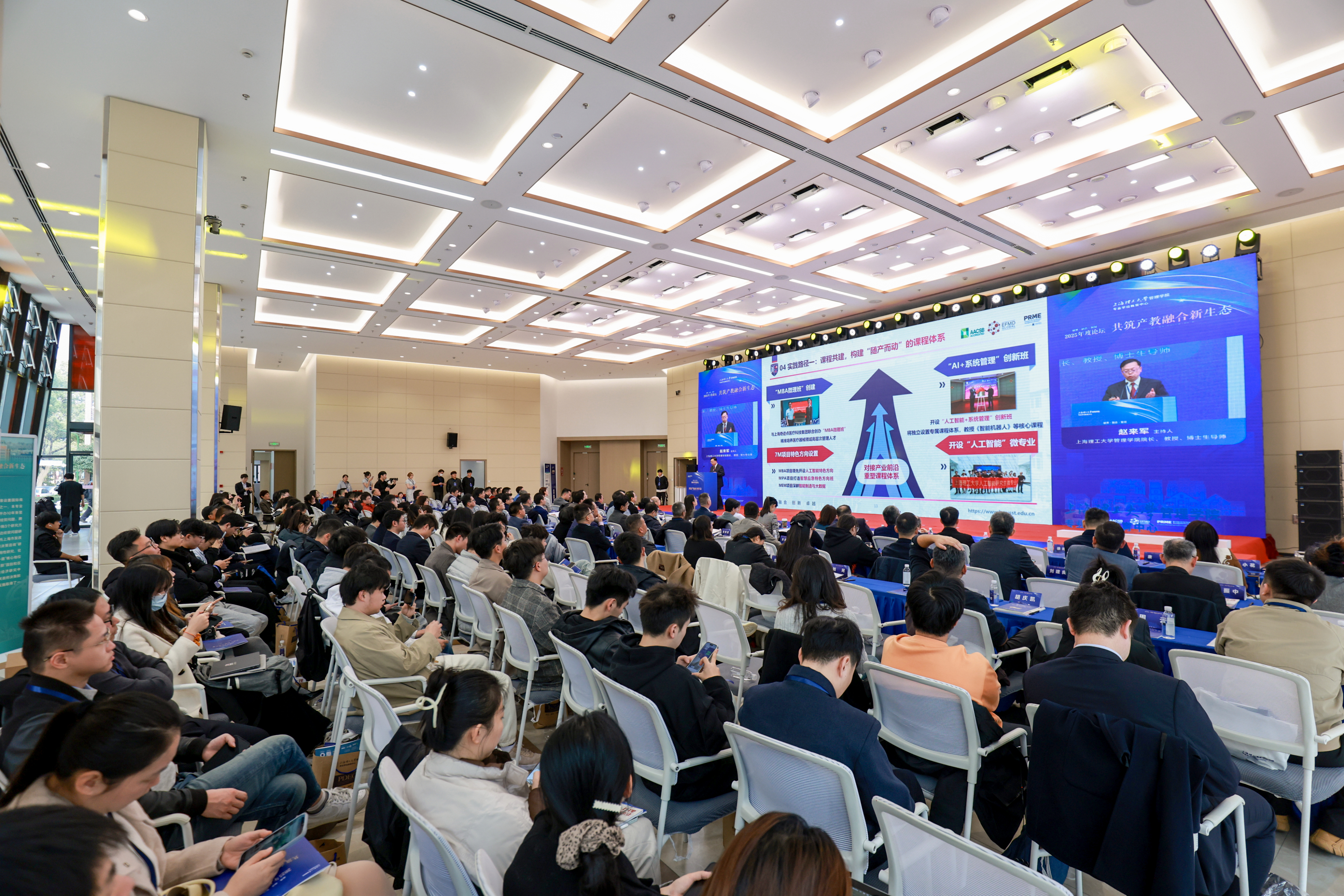 12月12日下午,上海理工大学管理学院在军工路校区举办“破界·融合·智创 共筑产教融合新生态”2025年度论坛。校党委书记王凌宇,霍尼韦尔(中国)总裁余锋校友,经纬创投合伙人、黄浦区政协委员唐磊校友,上海联创投资管理合伙人朱一凡,上海国创投资有限公司董事长、上海蓝丝带公益基金会理事长白俊平校友,相关职能部处负责人,管理学院党政领导等出席活动。论坛吸引近200名师生与校友代表现场参会,另有两万余人次线上同步观看直播。
