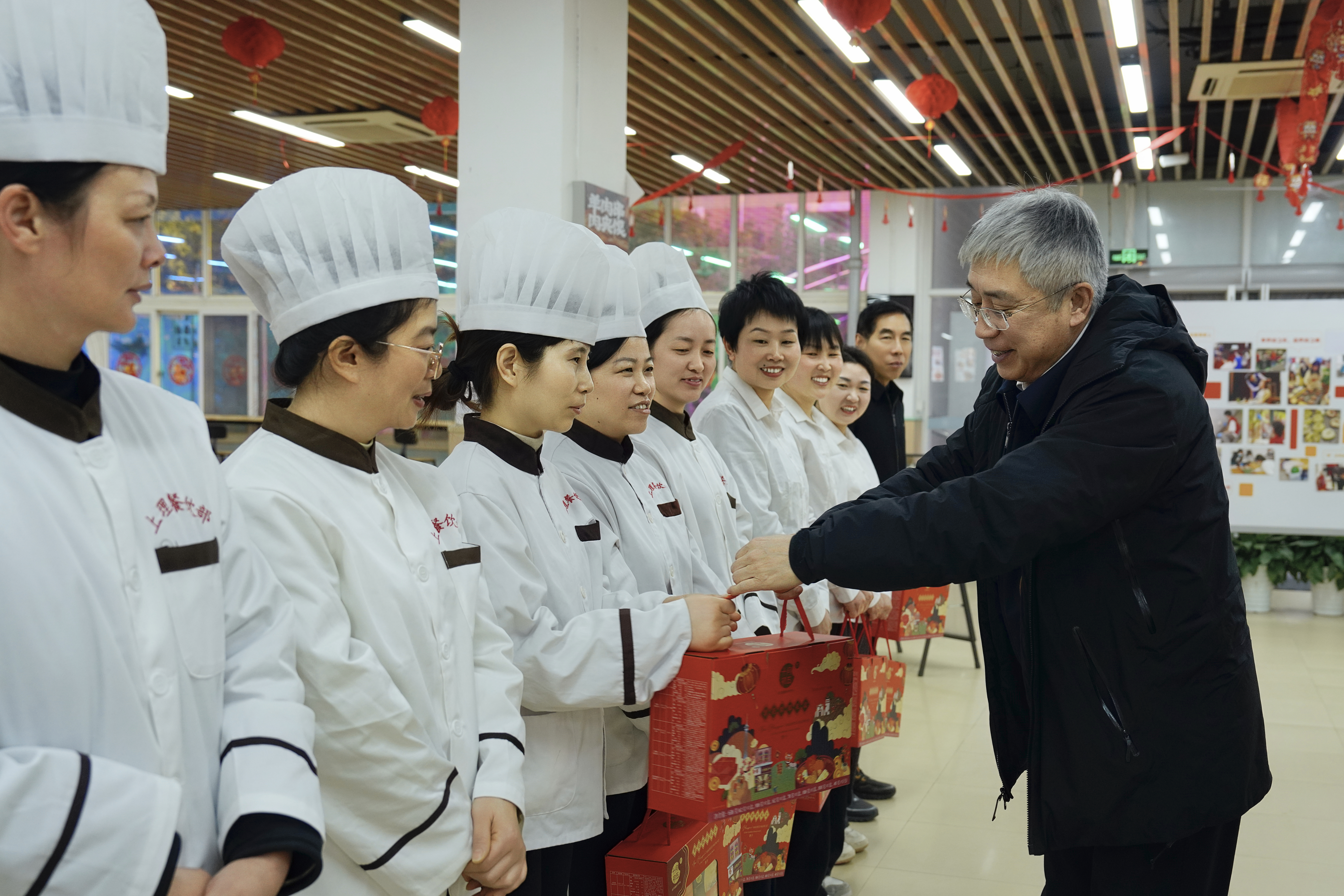 校领导一行先后走访了第一食堂、第二学生公寓二号楼、1100号校区建设工地、军工路580号门岗、保卫处监控中心等重点区域。每到一处,校领导都详细了解寒假期间各单位的工作运行情况,与坚守岗位的教职员工亲切交谈,送上慰问品并致以新春祝福。